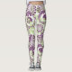 These leggings have a geometric design of circles decorated with lines and circles made of repeating dots in eggplant and green.