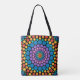 Multicolored tote bag with pink and colours of the rainbow on a black background.