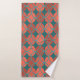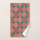 This towel set has a mid-century modern design of open circles on closed circles in shades of orange on a field of teal.