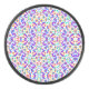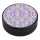 Circular item with a vibrant, symmetrical purple, green, and orange paisley pattern. The top image shows the flat design, while the bottom image presents it at an angle.