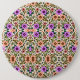 Circular pin badge with intricate floral pattern. Features purple, orange, and green flowers on a beige background. Backside shown with pin attachment.