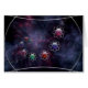 An illustration of infinity, crossing the universe to combine the microscopic and the telescopic in a rainbow display of shapes and colours. A column of multi-coloured atoms of blue, pink, red, and green circled by silver rings, spiralling across outer space against a backdrop of colourful fractal galaxies.