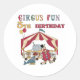 Circus 5th Birthday featuring the big top with a clown, seal, elephant, monkey, lion, tiger, zebra, and colourful, fun text.