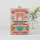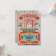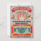 Super cute, rustic "under the big top" circus or carnival birthday party. Acrobats ride horses, big striped tent, banners and a VIP ticket to the birthday party against a wood panelled background. The back is decorated with a elephant balancing on a ball. Hand drawn illustration by McBooboo.