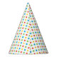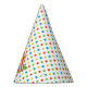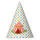 This circus themed party hat features a repeating pattern of red, yellow, blue and green stars and a clipart graphic of a red and white striped Cirucs Tent (big top)