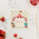 A paper napkin with red and white circus tent, a blue elephant and a clown with balloons. Coordinating items available.