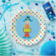 This party plate features a blue background surrounded by a repeating patter of red, blue, yellow and green stars. A cute cartoon circus clown holding a sigh stands in the middle of the plate.