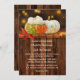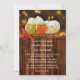 Une faire-part de mariage rustique et festive avec des citrouilles colorés et des feuilles de chute avec des lumières boisées et un arrière - plan en bois foncé. Cette invitation a une carte RSVP correspondante.