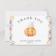 "Un petit citrouille est en route. Célébrez avec ce citrouille de dessins animés sur le thème du baby shower ! Aquarelle caricature kawaii citrouille avec casquette d'automne (casquette) et feuilles d'automne. Au verso de la carte se trouvent les feuilles d'automne.