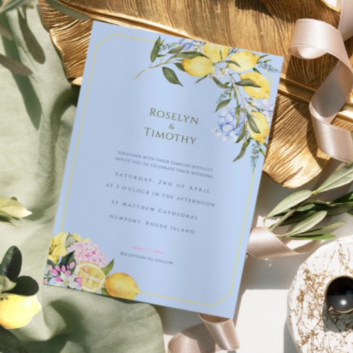 Elegant pastel Mediterranean wedding invitation featuring watercolor lemons, florals, and a romantic church illustration. Soft pastel hues in blue, pink, citrus green and lemon create a fresh, destination-wedding feel. Classic typography with a clean, timeless layout. Perfect for summer, coastal, or Mediterranean-inspired weddings. It's an All-in-one wedding invitation with the wedding schedule and all the wedding details and website information.
