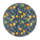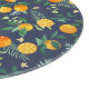 Tropical vibes with oranges, leaves, and flowers on blue.