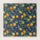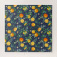 Tropical vibes with oranges, leaves, and flowers on blue.