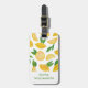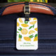 Colourful citrus fruit, lemon pattern personalized luggage tag on a white background with green text. Add your name or initials to the front, and your address details to the back. Please contact me for help with customization and special requests. © Zoe Chapman Design