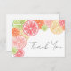 This flat thank you card features a bright and cheerful citrus theme, perfect for summer celebrations. The front design includes watercolor citrus slices—grapefruit, lime, lemon, and orange—in shades of pink, orange, yellow, and green, arranged along the top and left side. "Thank You" is displayed in the bottom right corner in a simple, elegant script.