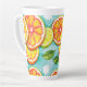 This large latte mug showcases a vibrant citrus design featuring juicy slices of orange, lemon, and lime illustrated in a lively, modern style. Set against a bright teal background with dynamic splash accents and fresh green leaves, the artwork creates an energizing, refreshing look that brightens every morning ritual. With its tall, elegant shape and generous capacity, this mug is perfect for lattes, cappuccinos, tea, cocoa, or cozy evening drinks. Durable, glossy, and full of personality, it brings a burst of color to daily routines and makes a cheerful, memorable gift for fruit lovers and fans of uplifting design.