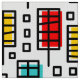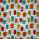 A colourful original retro-modern style design made up of rectangular leaf like motifs with offset colour rectangles.