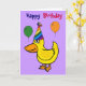 Drôle canard de dessin animé portant un casquette d'anniversaire avec des ballons carte d'anniversaire dit Joyeux anniversaire et à l'intérieur dit : Espère que votre anniversaire est juste Ducky!