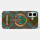 Le badge de crête Clan Anderson entouré d'une courroie et boucle sur l'arrière - plan tartan. Texte personnalisé.