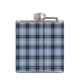 Monogrammed flask in the family tartan of Clan Bell, a traditional plaid pattern in light blue and black, with bright red, green, and yellow accents. Also known as Bell of the Borders. Available in two sizes.