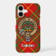 Clan Cameron crest badge surrounded by a strap and buckle over tartan background. Custom text.
