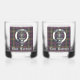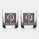 Stylish whiskey glasses featuring Scottish Clan Carnegie crest badge and text on tartan background