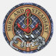 Clan Clark crest badge surrounded by a strap and buckle over tartan background. Custom text.