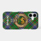 Clan Cockburn crest badge surrounded by a strap and buckle over tartan background. Custom text.