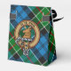 Clan Colquhoun crest badge surrounded by a strap and buckle over tartan. Custom monogram. Custom text.