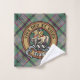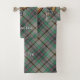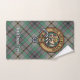 Clan Craig crest badge surrounded by a strap and buckle over tartan background. Custom text on each towel.