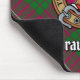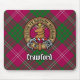 Clan Crawford crest badge surrounded by a strap and buckle over tartan background. Custom text.