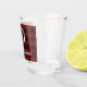 Stylish shot glass features Scottish Clan Cunningham crest badge and customizable text on tartan background