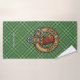 Clan Currie rooster crest badge surrounded by a strap and buckle over tartan background. Custom text on each towel.