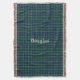 Colourful custom fringe end throw blanket made with graphics of the blue, green, and white clan Douglas tartan plaid pattern. Cream coloured old world style text can be personalized to read what you want. Lovely gift idea for anyone.