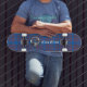 Stylish skateboard features Scottish Clan Elliot crest badge and customizable text on tartan background