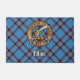 Clan Elliot crest badge surrounded by a strap and buckle over ancient tartan background. Custom text.