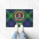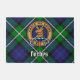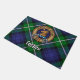 Clan Forbes crest badge surrounded by a strap and buckle over tartan background. Custom text.