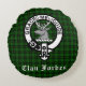 Stylish accent pillow featuring Clan Forbes tartan pattern background with crest badge and customizable text overlay