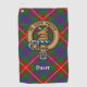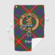 Clan Fraser of Lovat crest badge surrounded by a strap and buckle over tartan background. Custom text.