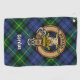 Clan Gordon crest badge surrounded by a strap and buckle over tartan background. Custom text.