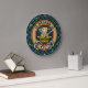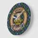 Clan Gordon crest badge surrounded by a strap and buckle over tartan background. Custom text.