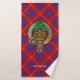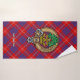 Clan Hamilton crest badge surrounded by a strap and buckle over red tartan background. Custom text on each towel.