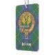 Clan Johnston crest badge surrounded by a strap and buckle over tartan background. Custom text on both sides.