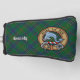 Clan Kennedy crest badge surrounded by a strap and buckle over tartan background. Custom text.
