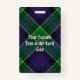 Clan Leslie crest badge surrounded by a strap and buckle over hunting tartan background. Custom text.