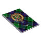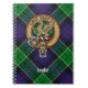 Clan Leslie crest badge surrounded by a strap and buckle over hunting tartan background. Custom text.