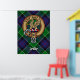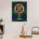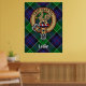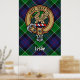 Clan Leslie crest badge surrounded by a strap and buckle over hunting tartan background. Custom text.