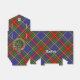 Clan MacBeth crest badge surrounded by a strap and buckle over tartan background. Custom text and monogram.