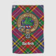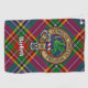 Clan MacBeth crest badge surrounded by a strap and buckle over tartan background. Custom text.