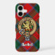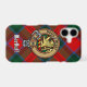 Clan MacDuff crest badge surrounded by a strap and buckle over tartan background. Custom text.