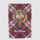 Clan MacFarlane crest badge surrounded by a strap and buckle over dress tartan background. Custom text.